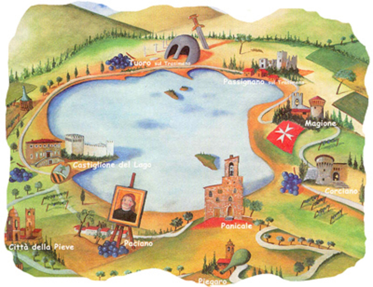 Numerose le bellezze paesaggistiche e storico-culturali presenti sul suo territorio: le tre isole (Maggiore, Minore e Polvese), le rocche e i castelli medioevali ed i numerosi paesi nati sulle sue rive o sulle sue colline: Castiglione del Lago, Paciano, Panicale compresi tra “I borghi più belli d’Italia”, Passignano, Castel Rigone, Magione con il suo Castello dei Cavalieri di Malta, Tuoro famoso per essere stato teatro della “Battaglia del Trasimeno” avvenuta il 24 giugno del 217 a.C. nella quale l’esercito di Annibale sconfisse i romani, ed ancora i poco più distanti ma bellissimi borghi di Città della Pieve, di Corciano (verso Perugia) e di Cortona (verso Arezzo), ecc. ecc.