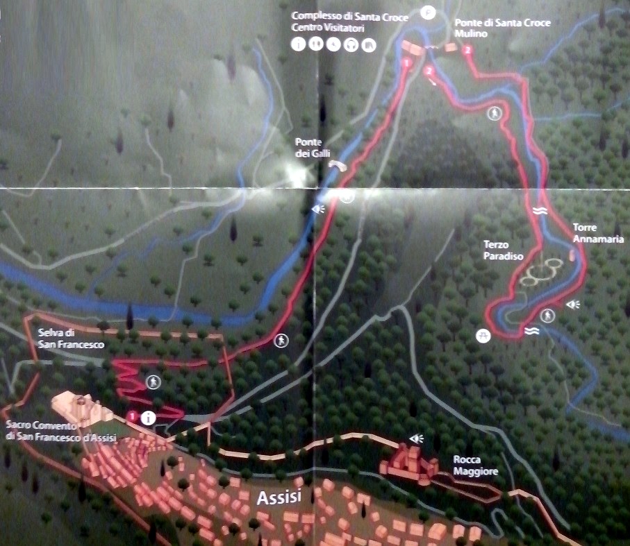 Il percorso di visita è diviso in due parti, entrambe con punto di partenza nell’antico complesso benedettino di Santa Croce (dove è stato realizzato anche il centro informazioni), di cui sono ancora oggi visibili i resti del monastero, della chiesa, del ponte, del mulino e di una torre-opificio. Il primo tratto sale per c.a. 1,5km nel bosco fino alla Basilica di San Francesco. Il secondo percorso è costituito da un piccolo anello di c.a. 2km, che conduce in una radura sulla vallata del Tescio nella quale spicca la Torre Annamaria riportata alla luce dagli scavi archeologici, e dove trova sede l’opera di land art realizzata da Michelangelo Pistoletto “Il Terzo Paradiso“.
