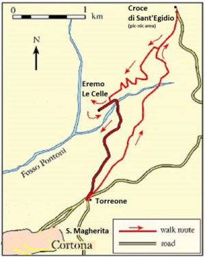 Punti d’interesse: Strada Basolata / Eremo Le Celle / Croce di Sant’Egidio / Basilica di Santa Margherita / Cortona