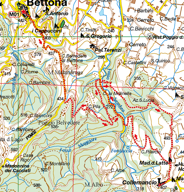 Inoltre, per chi vorrà coniugare la visita al piccolo borgo con un bel trekking, ai piedi dell’area archeologica di Urbinum Hortense (proprio nei pressi dei ruderi della chiesa della “Madonna del latte”, un edificio diroccato i cui resti sono ormai stati completamente ricoperti da edere e da radici di fico che hanno inglobato le pietre) e possibile individuare con facilità il segnavia M01 del sentiero Collemancio-Bettona. Si tratta di un bel percorso immerso nel silenzio della natura e in gran parte boschivo. L’articolazione dei sentieri fa sì che sia possibile effettuare un piccolo anello partendo da Collemancio o raggiungere l’abitato di Bettona, per un percorso che nel suo complesso (completandolo interamente a/r in una delle due direzioni) arriva a c.a. 19Km per quasi 5 ore di percorrenza. [vedi la Mappa del percorso]