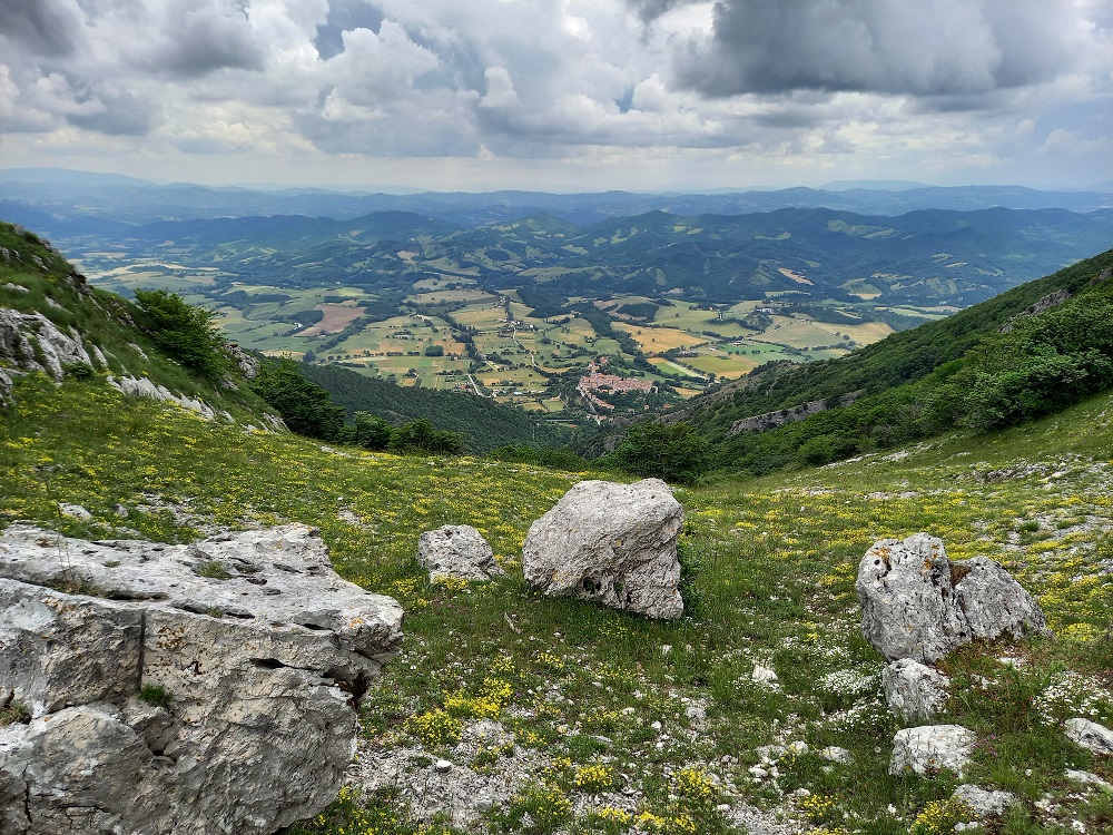 Giunti sotto la Punta Sassopecoraro si incrocia la carrozzabile proveniente da Scheggia; si continua verso dx sulla strada bianca fino ad arrivare a dei prati e ad un tabellone che indica di salire verso sx sul sentiero 277 (20) che si addentra nel bosco di faggi. Salendo ancora si arriva ad un bivio (Ranco Cerasa) e si prosegue verso sx con una salita abbastanza impegnativa fino alla Sella Col d’Orlando. Poi ancora in salita sulla sx per il sentiero 234 (8) che porta fino in vetta a Monte Le Gronde (1373mt). La vista a 360 gradi da questa piccola radura sommitale è veramente meravigliosa.