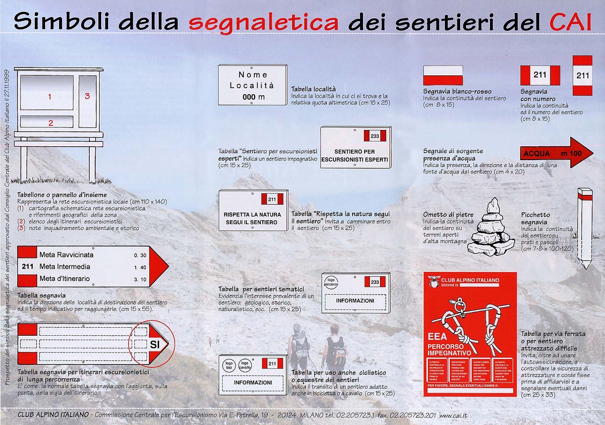 il luogo di destinazione di quella tratta e durata di percorrenza prevista (che in genere non considera le soste e che và comunque rapportata alla propria andatura rispetto la media). Nel Centro Italia la segnaletica prevalente è quella di colore bianco-rosso classico del CAI, ma non è raro trovare la segnaletica gialla o azzurra e quella dei sentieri di carattere religioso (come ad esempio il “tao” dei percorsi Francescani).